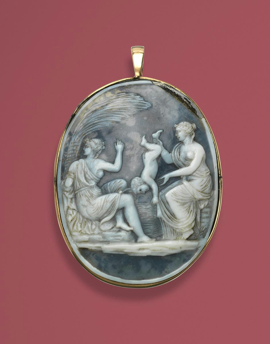 A gold pendant mounted with an oval carved oyster shell cameo, late 18th century. Backed on pitch and slate. Carved with the scene of the baby Achilles being dipped in to the river styx by his nymph mother Thetis. 5.5cm high.