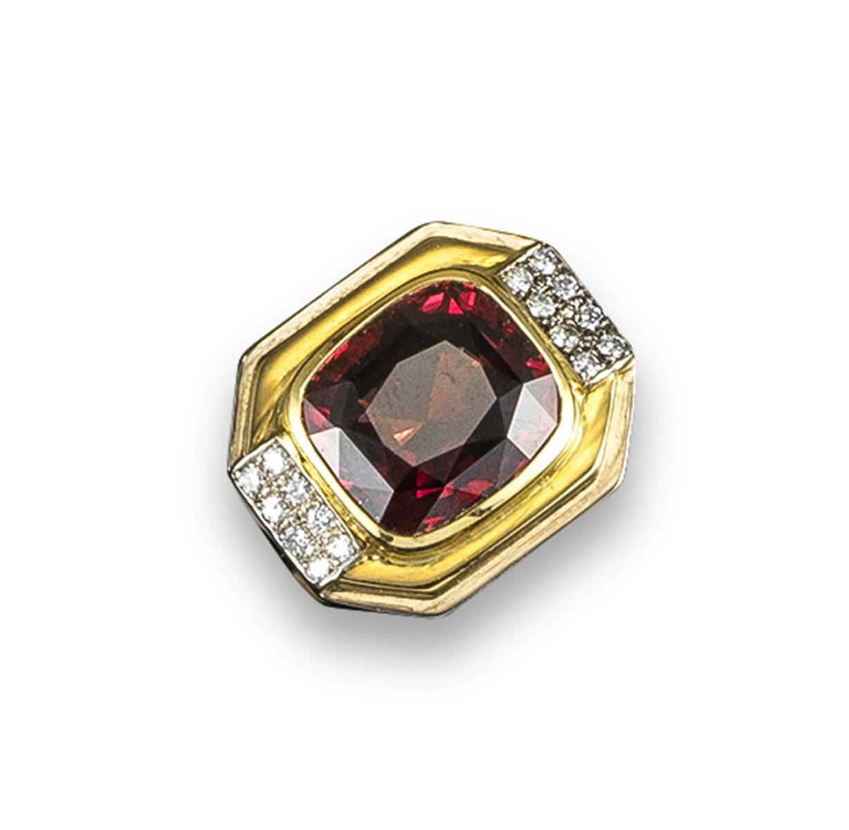 A garnet and diamond dress ring, the large cushion shaped garnet is set within an octagonal gold mount, flanked either side by two rows of circular cut diamonds in platinum and yellow gold. French control marks. Size K.