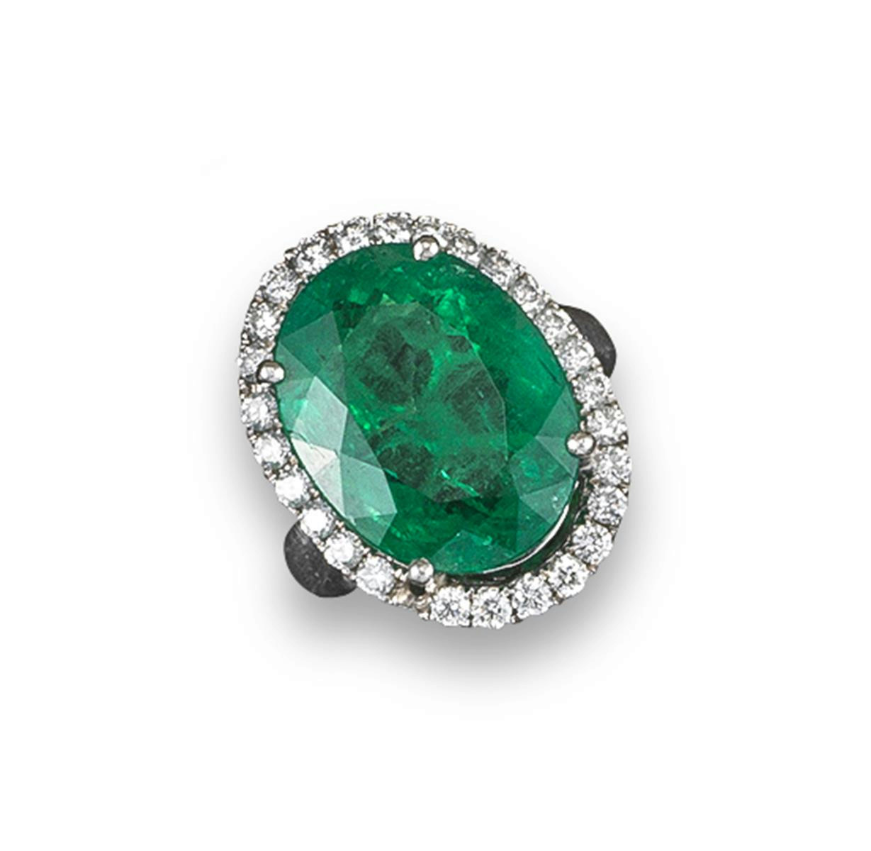 An emerald and diamond cluster ring, the oval shaped emerald is set within a surround of circular cut diamonds in platinum. With further smaller diamonds set to the underbezel. Size M.