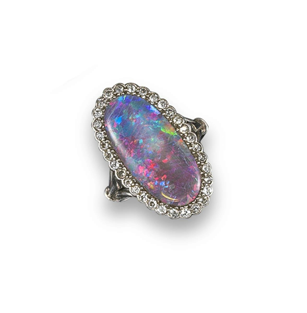 An early 20th century opal and diamond ring, the solid black oval shaped opal is set within a surround of single cut diamonds in platinum. Size M 1/2.