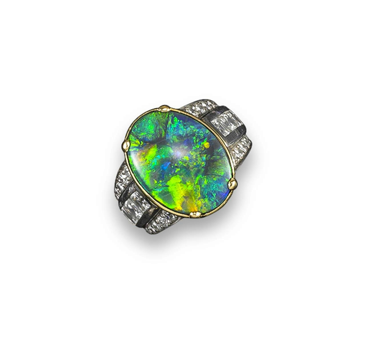 An opal and diamond set platinum ring, the oval shaped solid black opal is set with three rows of circular and baguette shaped shoulder diamonds. Size N ½.