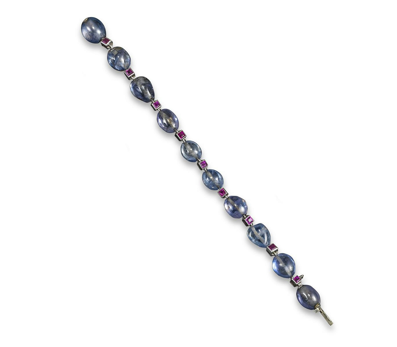 A sapphire and ruby bracelet, alternately mounted with polished sapphires and square shaped rubies. 17cm long.