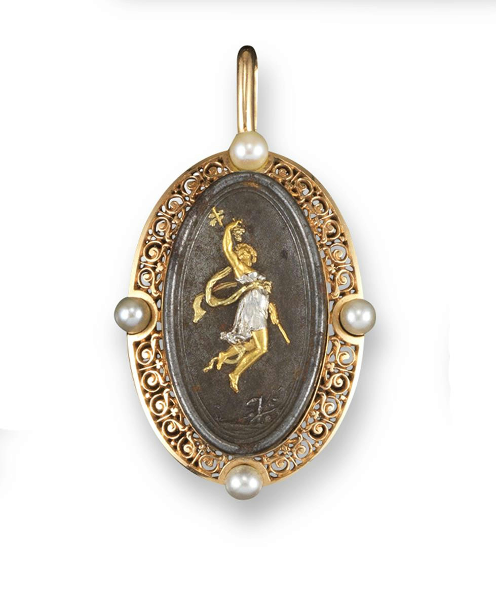 A French oval shaped gold and shakudo pendant, the shakudo panel depicting a dancing girl, within carved and pierced yellow gold border set with four pearls. French control marks. 3cm wide.