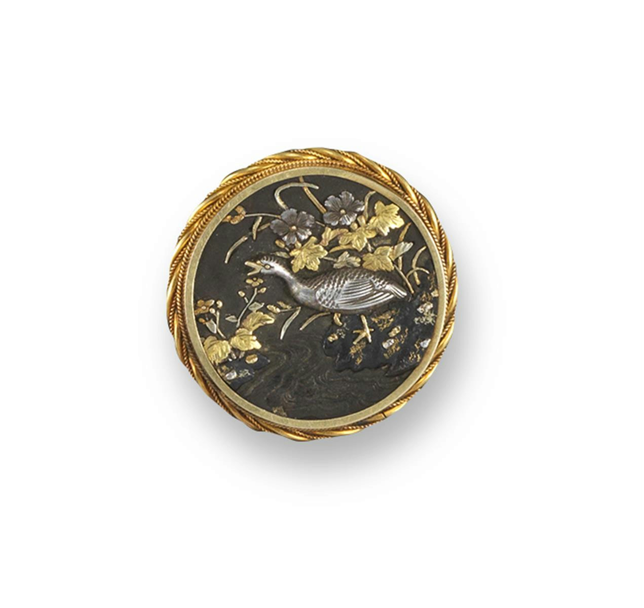 A circular gold mounted shakudo brooch, depicting a bird amongst foliage. Within a gold ropetwist border. 2.8cm wide.