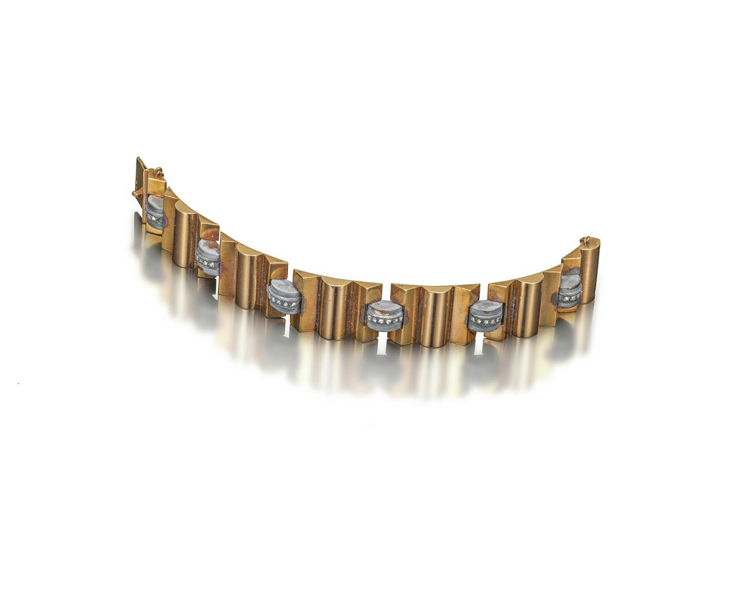 A gold bracelet C1940, of geometric triangular and semi cylindrical diamond set links. 62g. 18cm long. Centre smaller links tarnished.
