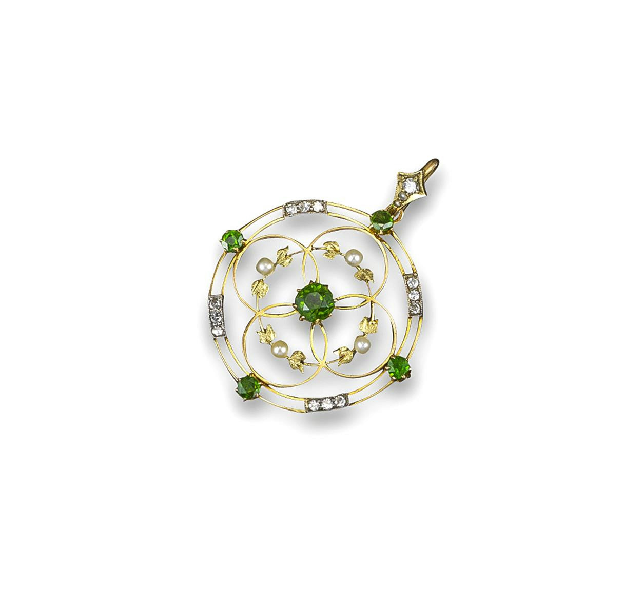 An Edwardian circular scroll pendant, set with five graduated circular cut demantoid garnets, seed pearls, and four sections of three small circular cut diamonds. 3cm wide.