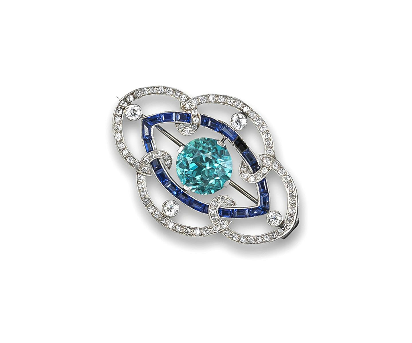 An early 20th century zircon, sapphire and diamond brooch, the old circular cut zircon is set within a calibre cut, navette shaped sapphire (one missing) border and a further swirling quarterfoil border of circular cut diamonds in platinum. 4.2cm wide.
