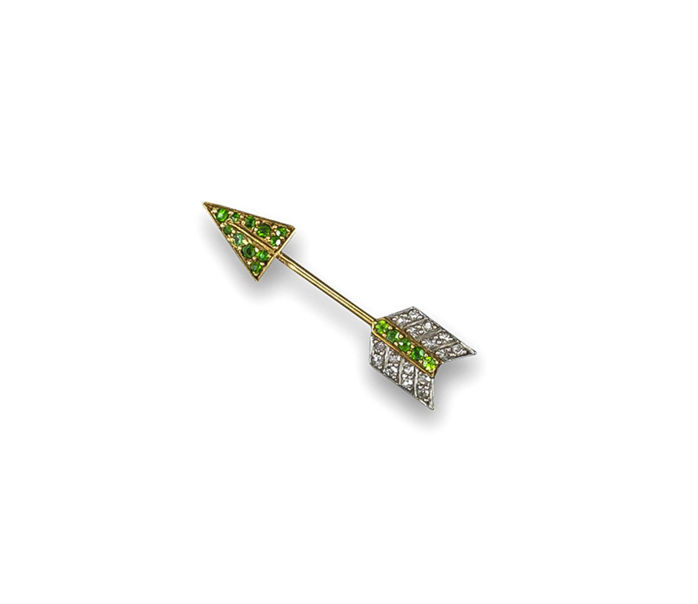 A demantoid garnet and diamond set arrow brooch. 3.2cm wide.