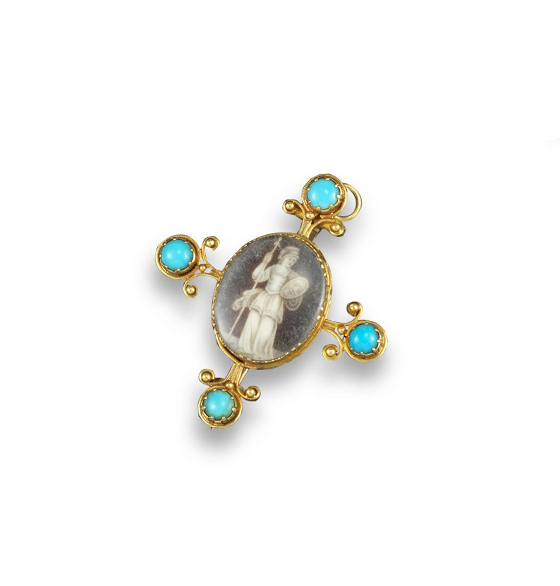 A 19th century cruciform gold brooch, centred with a sepia drawing of Brittania. Mounted with a cabochon turquoise to each terminal.
