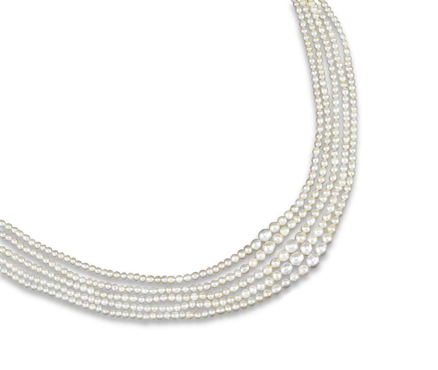 A five row graduated natural pearl necklace