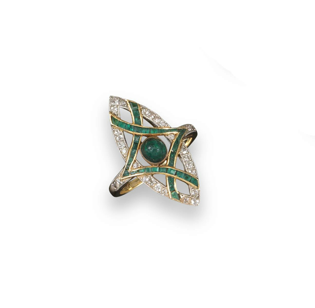 A Russian Art Nouveau emerald and diamond set navette shaped ring
