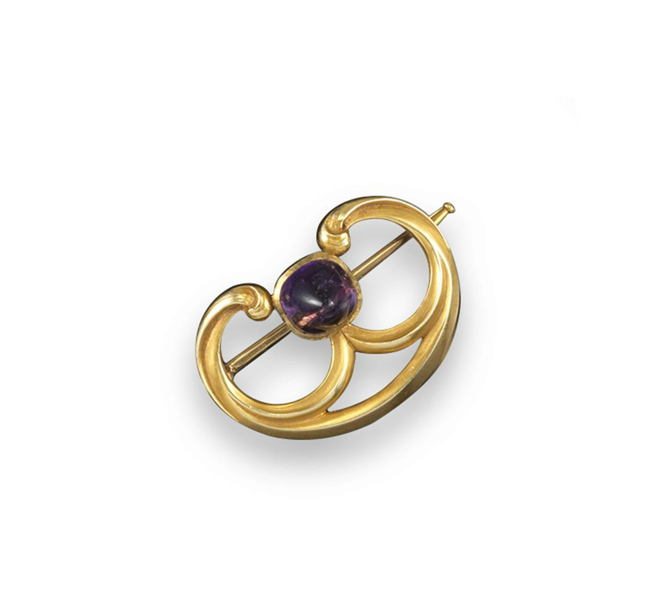 A gold scroll brooch mounted with a cabochon amethyst by Fabergé. Moscow 1896 - 1908. Stamped to the reverse with cyrillic KF and kokoshnik, repeated to the gold pin and numbered 23948. 2.8cm wide.