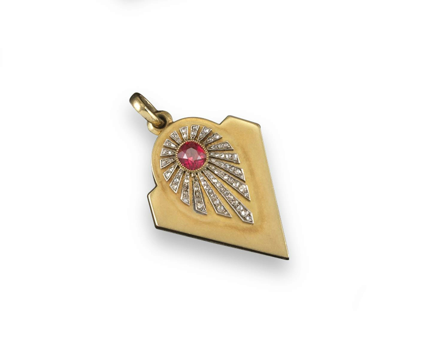 A gold shield shaped double locket pendant by Fabergé, workmaster August Hollming. The cover mounted with an oval shaped spinel within a burst of graduated rose cut diamonds. Opening to reveal two lockets. 3.5cm high. Marks - inside the back locket, workmaster's initials. AH with star between and kokoshnik with 56 zolotnik mark and St Petersburg alpha. In wooded box with later fitted section and the silk lining marked for Fabergé in Cyrillic beneath Imperial eagle.