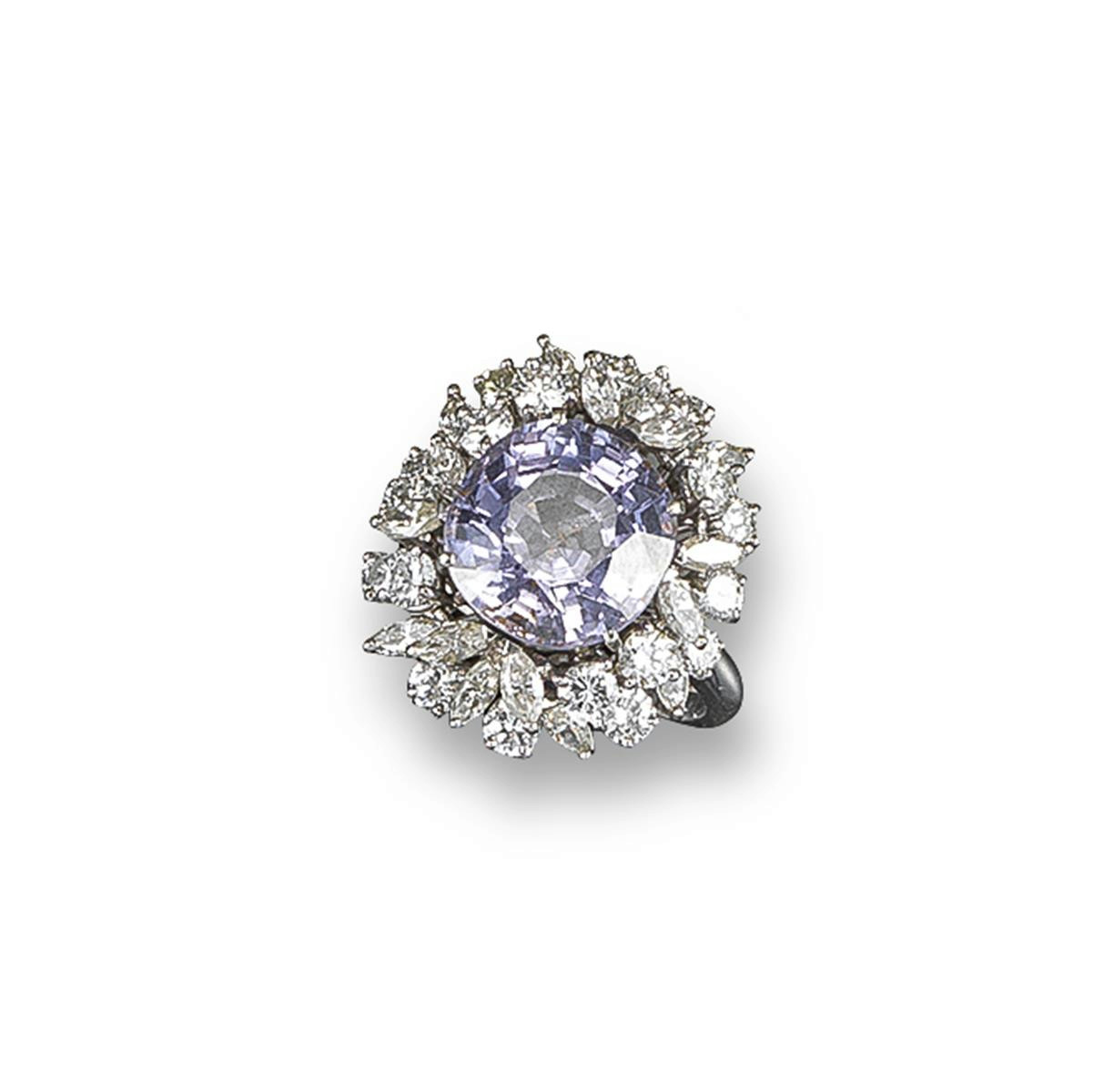 A spinel and diamond cluster ring, the cushion shaped light mauve spinel is set within surrounds of marquise shaped and circular cut diamonds in white gold. Size O.