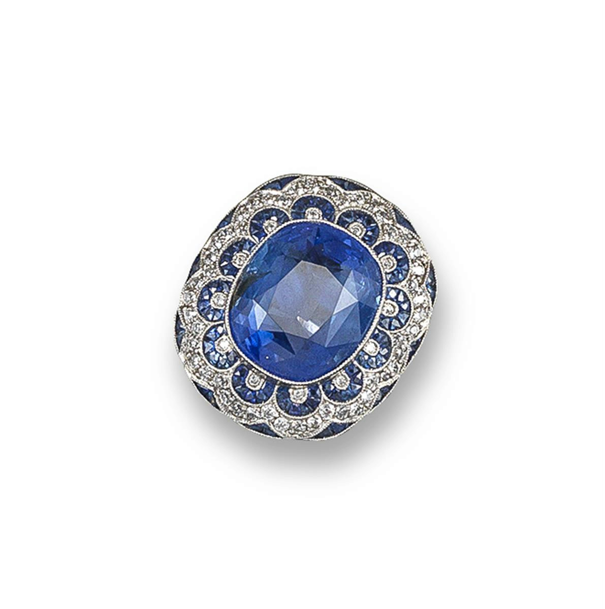 A large sapphire and diamond cluster ring, the cushion shaped sapphire measures 14.15 x 12.7 x 7.61mm deep and weighs approximately 11.00cts, and is millegrain set within a surround of sapphires and diamonds in a geometric pattern. Set with eight small shoulder diamonds in white gold and platinum. Size P ½.