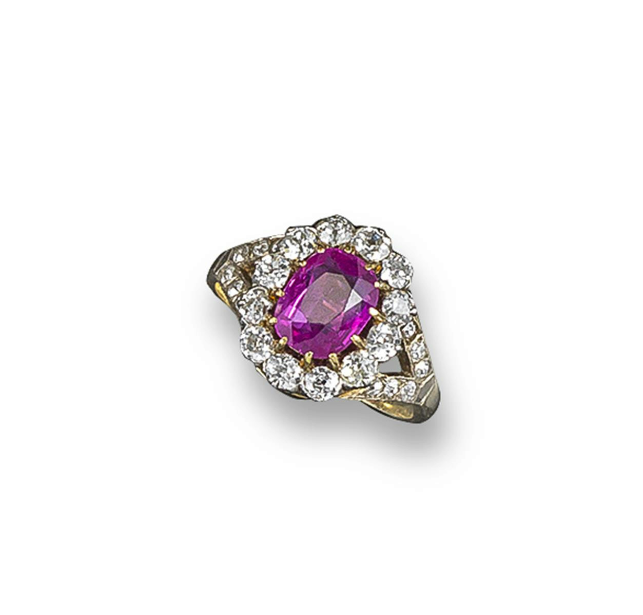 A pink sapphire and diamond cluster ring, the oval shaped sapphire is set within a surround of twelve cushion shaped diamonds and the V-form shoulders set with further diamonds in gold. Size L ½.