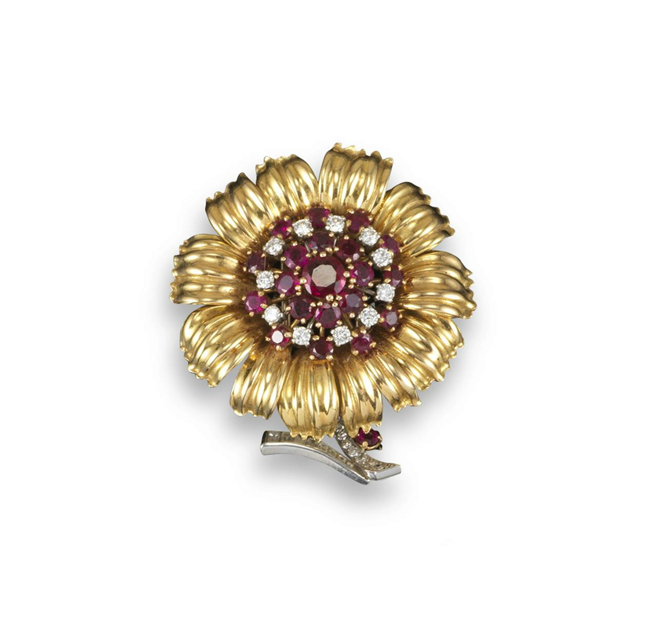 A ruby and diamond set flower head brooch, centred with a cluster of graduated circular cut rubies and diamonds with yellow gold petals. The stem set with baguette shaped and circular cut diamonds and a ruby. Indistinctly signed to the reverse, possibly Cartier. London. Case.