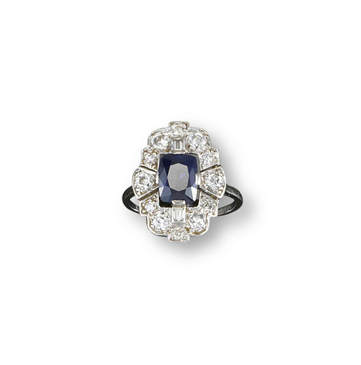 An Edwardian sapphire and diamond set plaque ring, the cushion shaped sapphire is set within a surround of circular and baguette shaped diamonds in platinum. Size N.