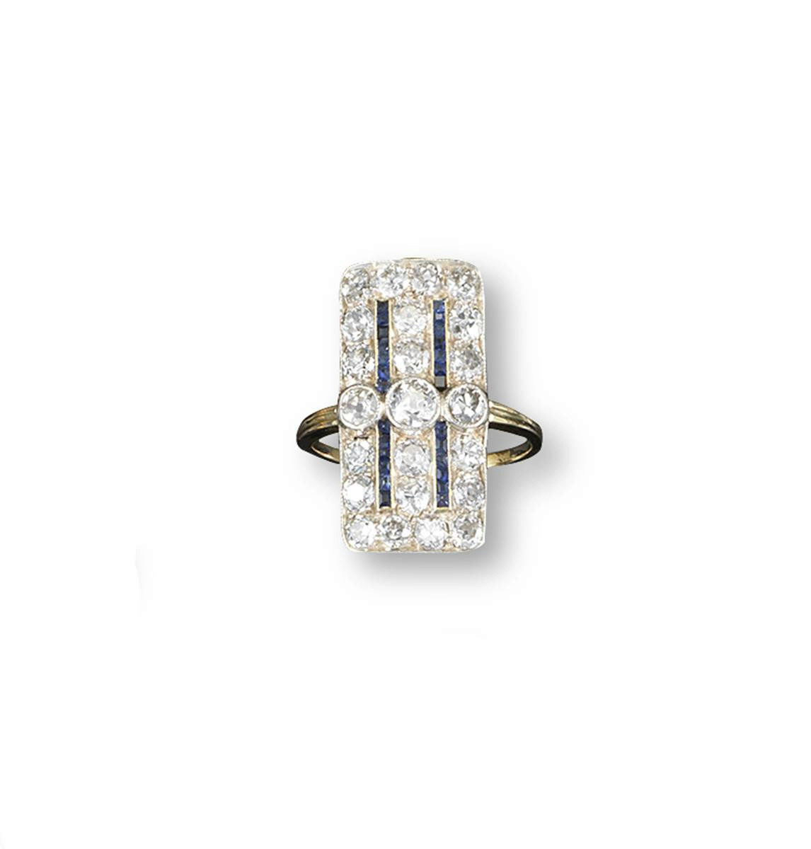 An Edwardian diamond and sapphire set platinum and gold rectangular plaque ring