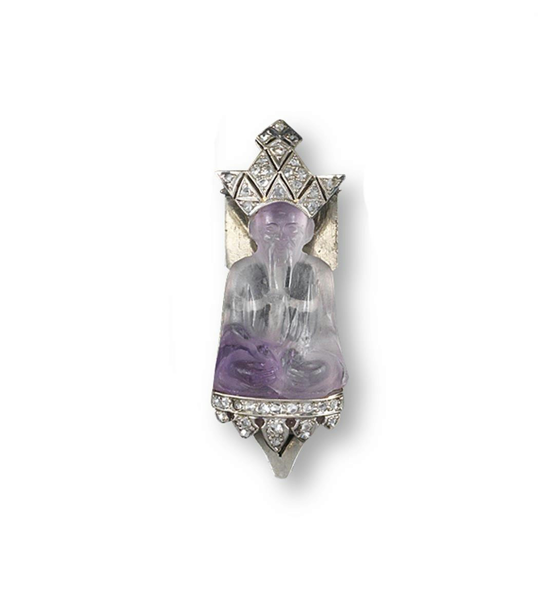 A carved amethyst Buddha clip, with millegrain set diamond terminals in platinum. 3.5cm high.