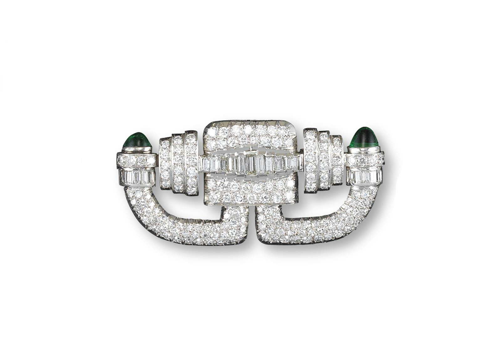 An Art Deco brooch, C1935, set with diamonds and emeralds. The geometric shape pave set overall with graduated circular cut diamonds and with a centre line of graduated baguette shaped diamonds and further baguette shaped diamonds to the cabochon emerald mounted platinum terminals. 5.8cm wide. Fitted case by Harvey & Gore.