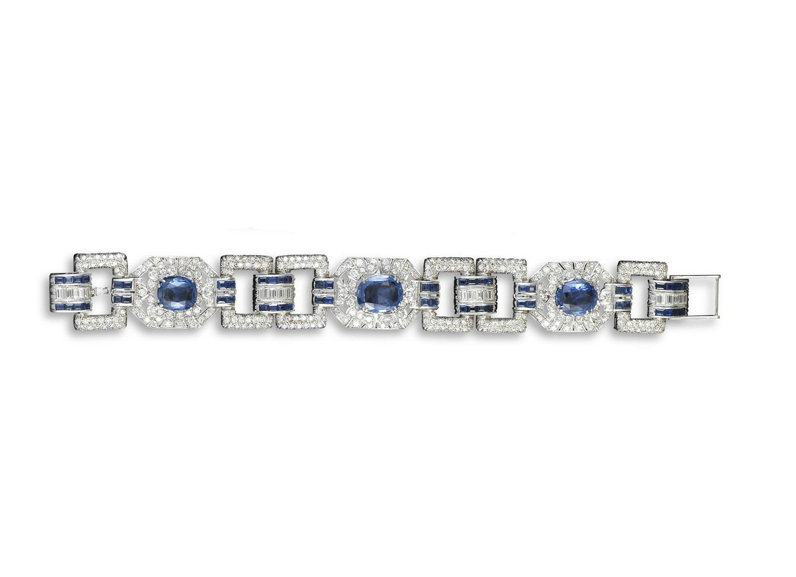 A sapphire and diamond set Art Deco style white gold panel bracelet, formed with three octagonal open work panels each centred with an oval shaped sapphire and millegrain set with graduated circular cut diamonds. With further rectangular diamond set panels joined with square sections set with a central line of baguette shaped diamonds and square shaped sapphire borders. 19.5cm.