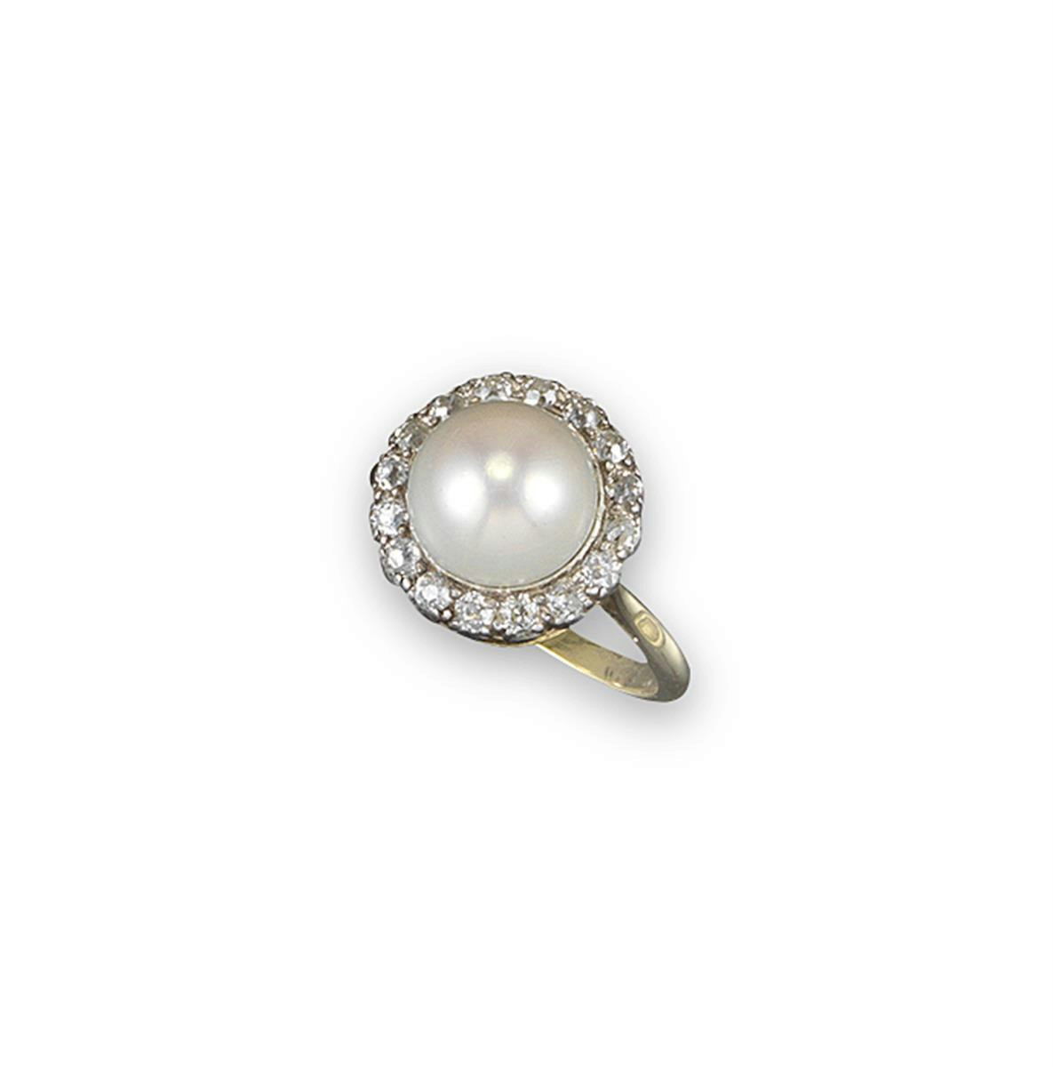 A natural pearl and diamond cluster ring, the pearl is set within a surround of sixteen old circular cut diamonds in silver and gold. Size Q.