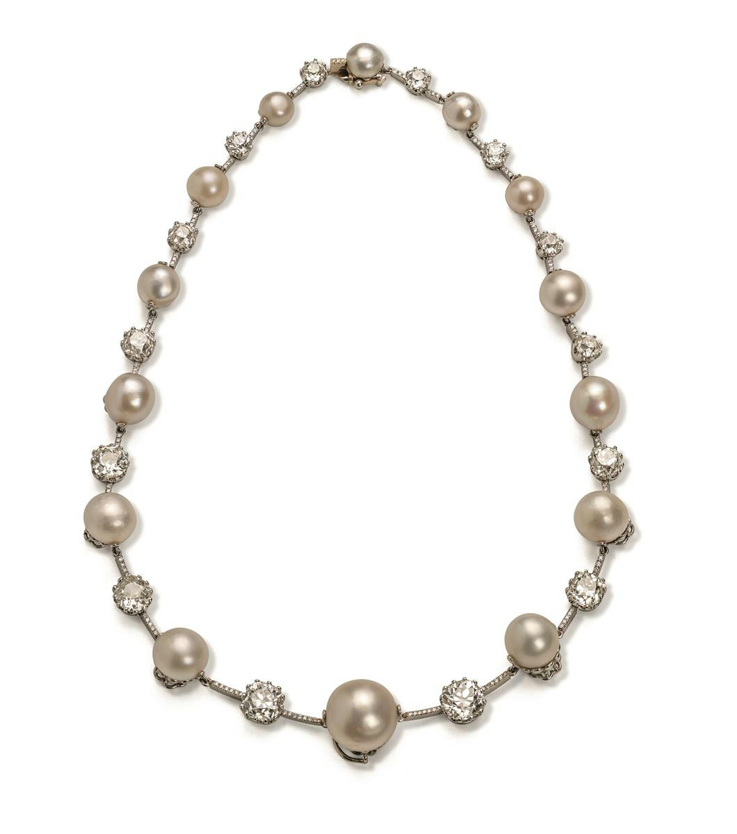 A necklace mounted with fourteen graduated natural pearls and fourteen graduated cushion shaped...