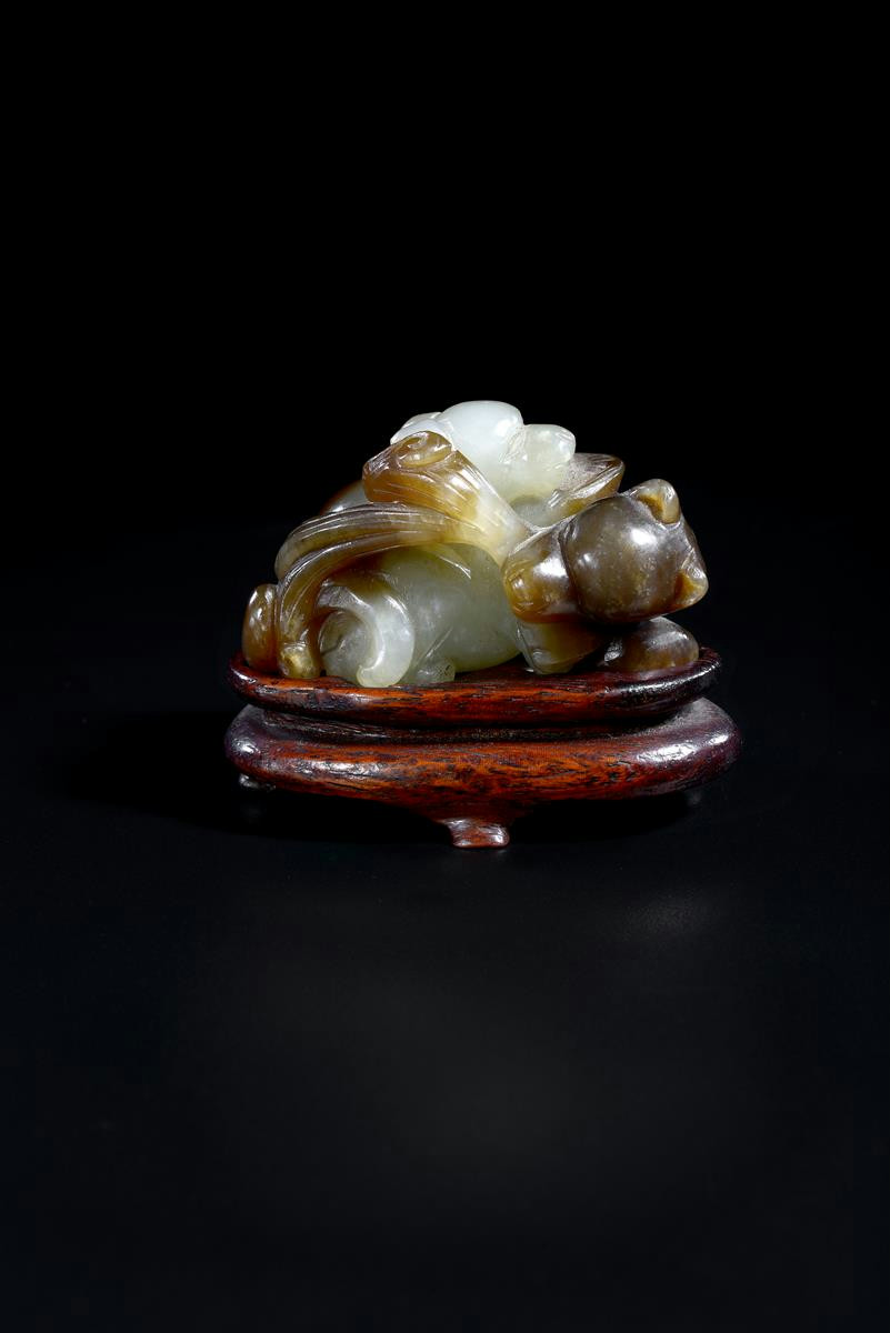 A Chinese pale celadon and brown jade carving of two badgers 18th/19th century, lying together, each holding a lingzhi spray in its mouth, one brown, the other pale celadon, a paper label for Sydney L. Moss Ltd., a fitted hardwood stand, 5cm. (2)
