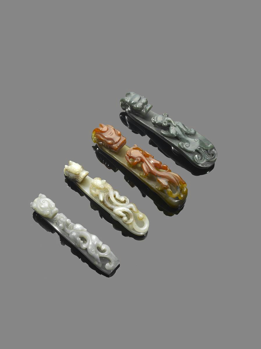 Four large jade and hardstone belthooks 19th century, all carved with dragon's head terminals, a confronting smaller chilong upon the shaft, 12.5cm. (4)