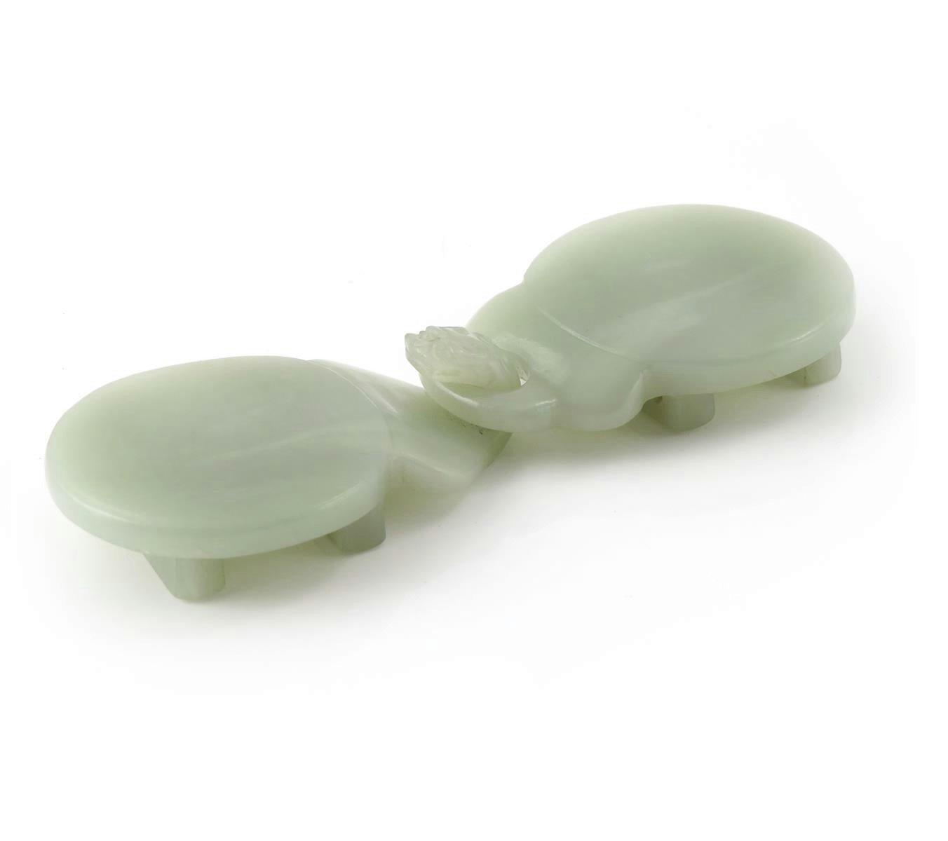 A Chinese celadon jade belt buckle 19th century, formed in two halves, each with a plain circular plaque, joined by a dragon's head terminal, 13cm. (2)