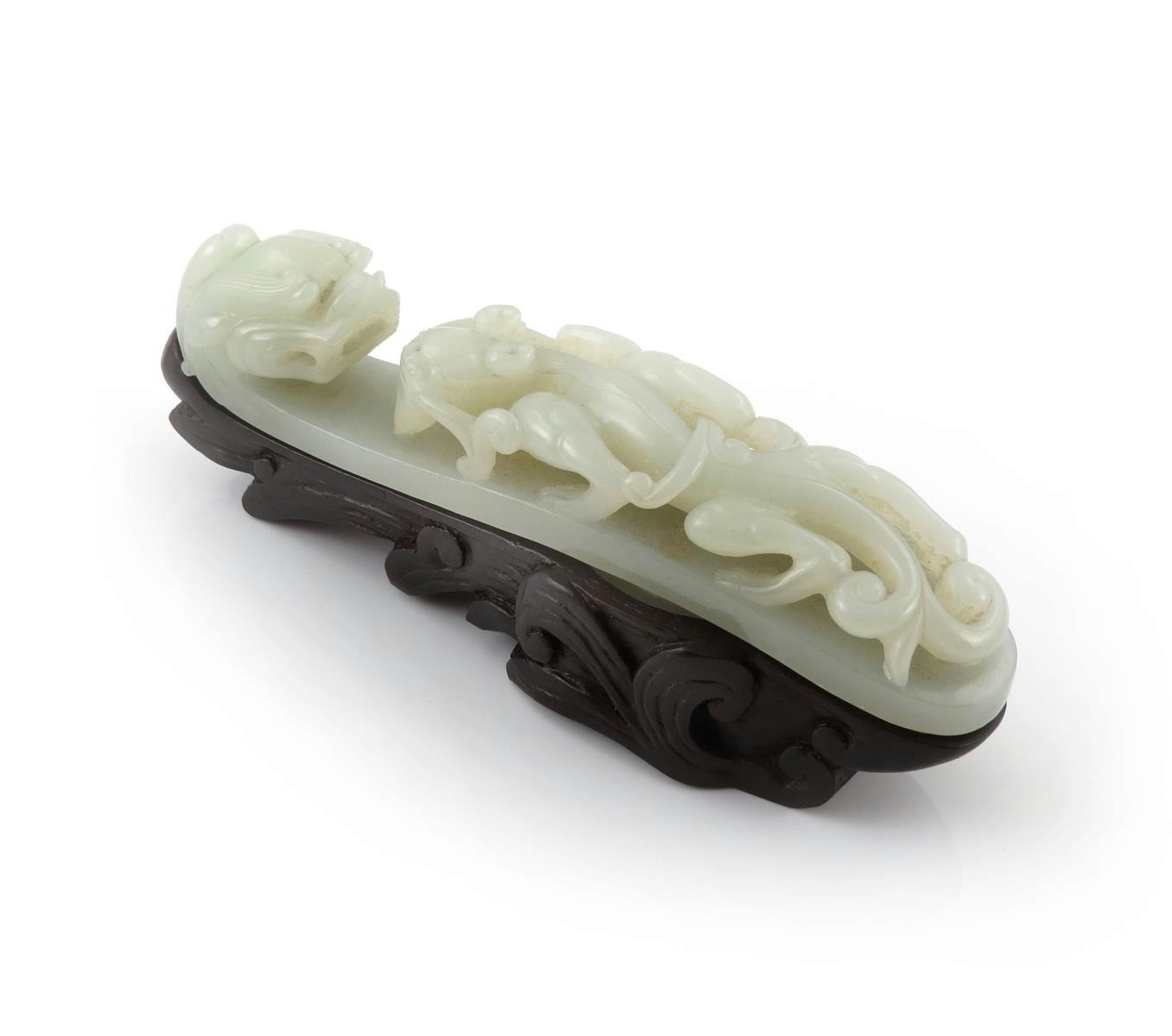 A large Chinese pale celadon jade belthook 18th century, carved with a dragon's head terminal, the shaft with a smaller sinuous dragon, carrying a lingzhi fungus in its mouth, raised on a fitted hardwood stand, 13.7cm. (2)