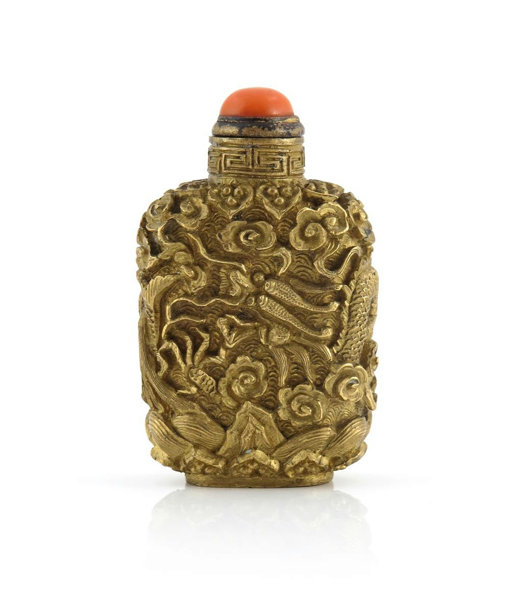 A rare Chinese gilt bronze snuff bottle 18th/19th century, cast in relief with a five-clawed dragon, a pagoda and a fish amongst cloud scrolls, with waves crashing on rockwork beneath, all within bands of ruyi and key fret, the base with a three character mark which reads shen de tang, 7.1cm.