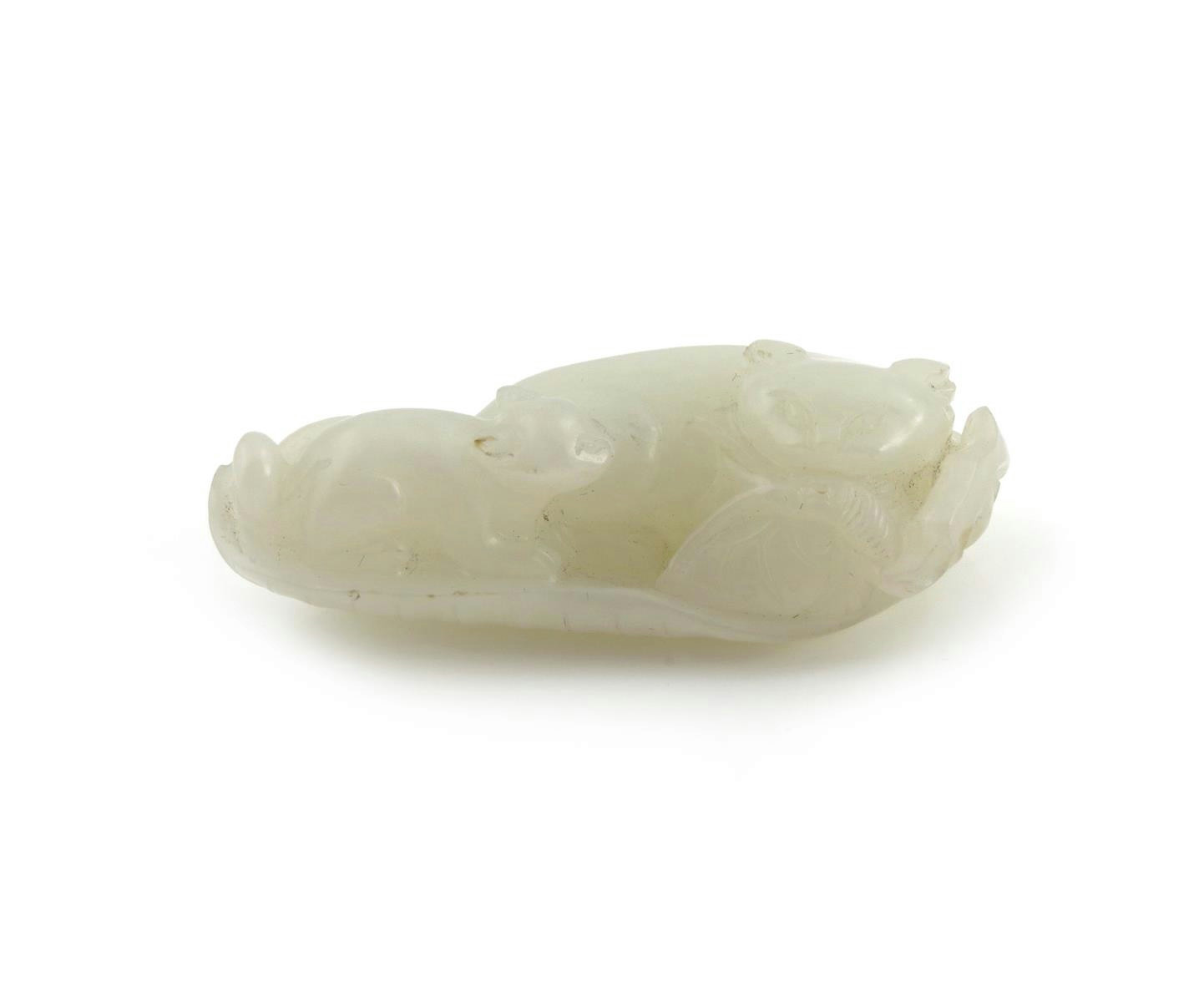 A Chinese white jade carving of a cat and her kitten 19th century, both resting together on a large artemesia leaf, the larger animal with a butterfly caught in her jaws, 6.8cm.