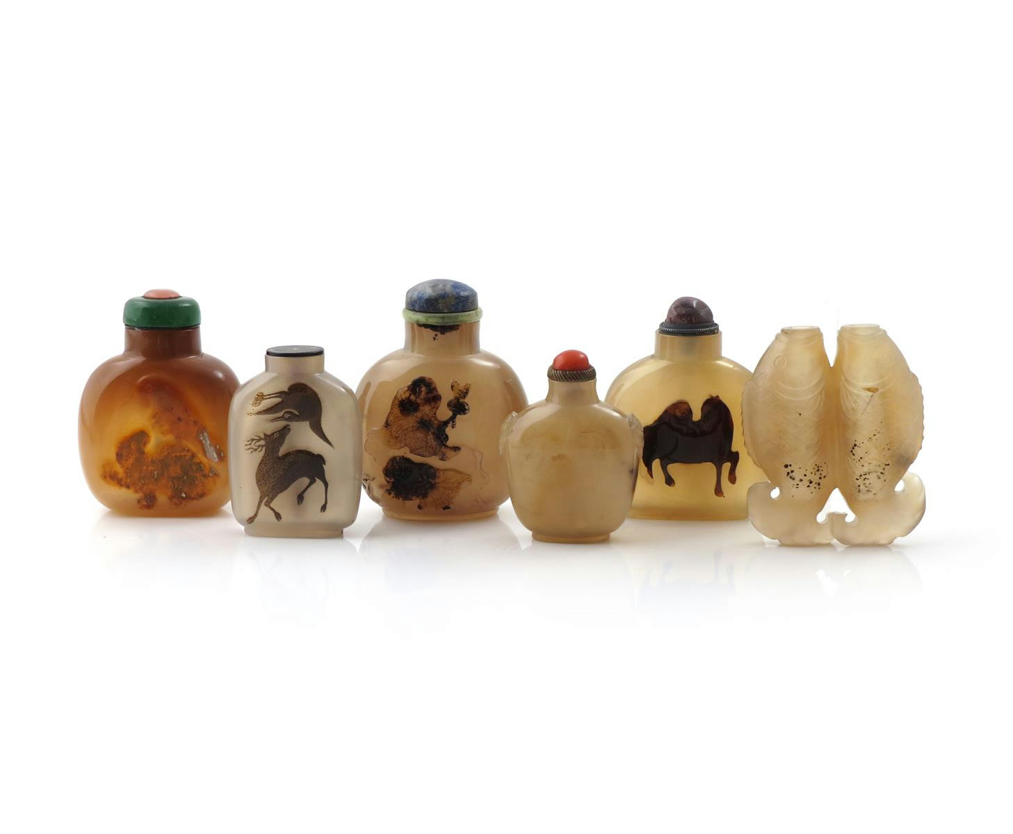 λ Six Chinese agate snuff bottles 19th century, one carved as twin fish, the others of ovoid form, each carved in relief variously with a deer and a crane, a horse and monkey, a bear and bird and figures, the last plain with ruyi-shaped handles, 8cm max. (6)