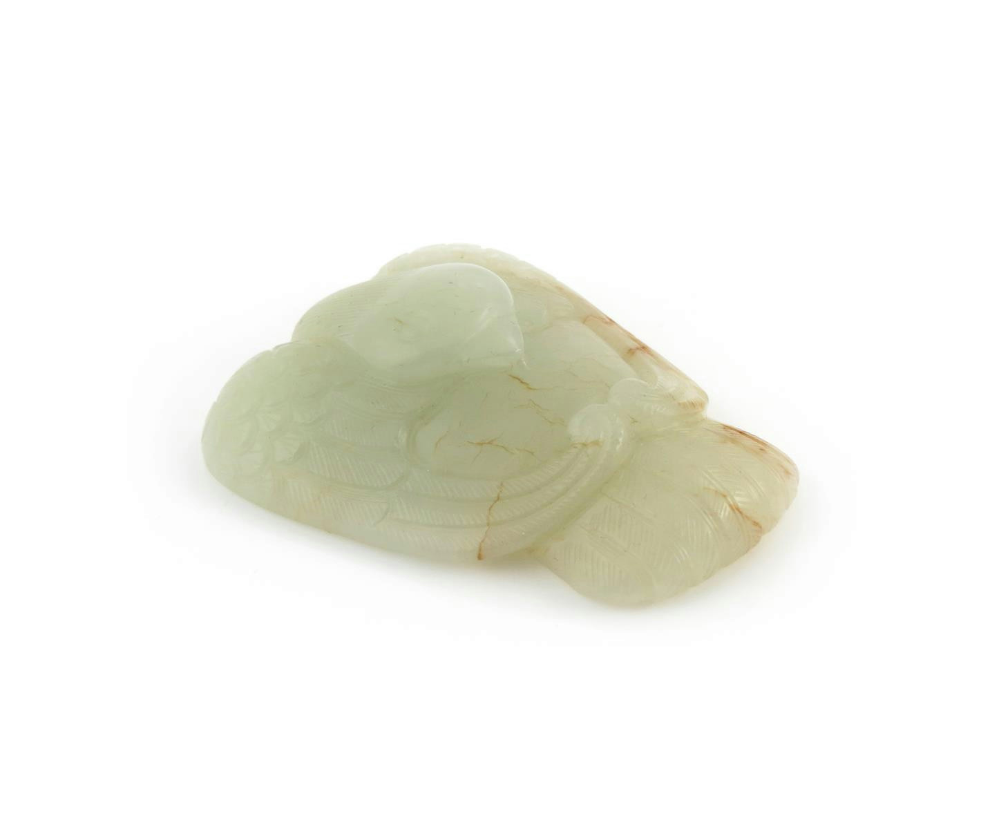 A Chinese pale celadon jade carving of an archaistic bird, xiao 18th/19th century, with its wings curling symmetrically behind its back, the head resting over its body, the feathers finely defined, the stone with russet striations, 5.7cm.