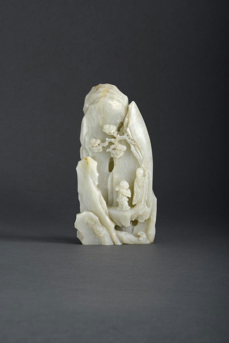 A Chinese celadon jade boulder carving 18th century, carved as a rocky mountain, with Shoulao and an attendant carrying a lingzhi fungus on a path above a river, a pine tree issuing from the rocks above, the reverse with two deer, 20cm.