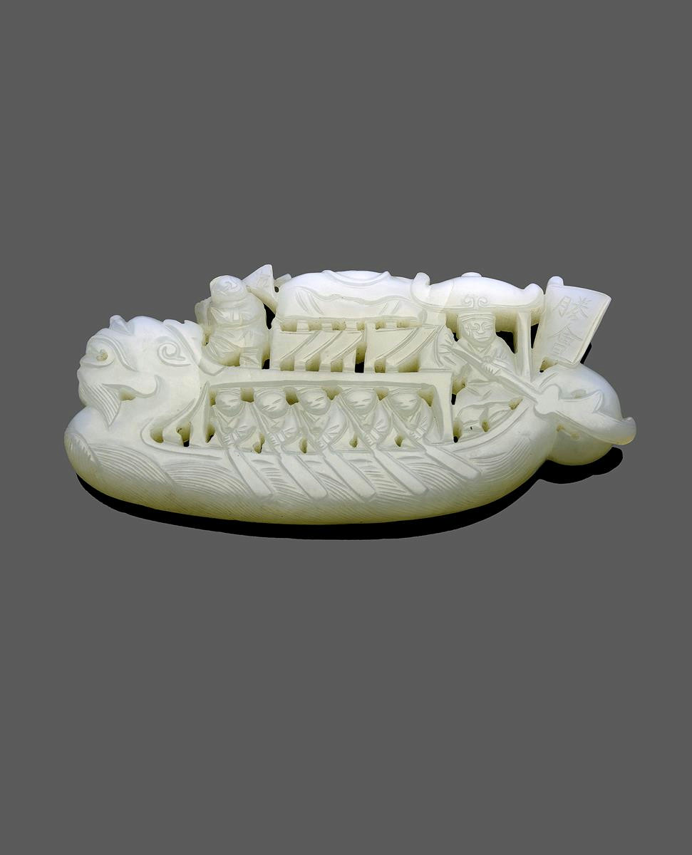 A Chinese white jade openwork plaque 18th/19th century, in the form of a dragon boat, with oarsmen and a figure holding a halberd inscribed with two characters which read shang hui (victory party), and a boy with a flag, 9.4cm.