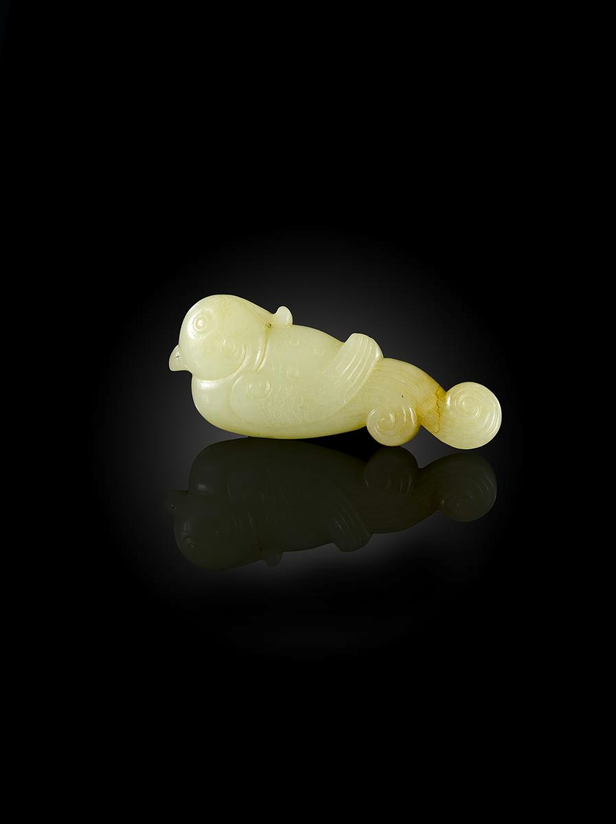 A Chinese yellow jade pendant 18th century, carved as a bird with its head facing forwards, the wings and tail with stylized feathers, 6.2cm.