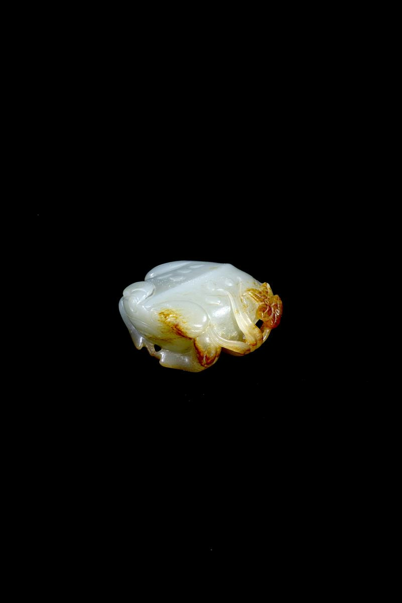 A rare Chinese pale celadon jade carving of a toad 17th/18th century, the amphibian crouching with a curved spine and spotted back, a flowering leafy tendril beside him, his webbed feet tucked neatly beneath his body, the stone with russet markings, 5cm.