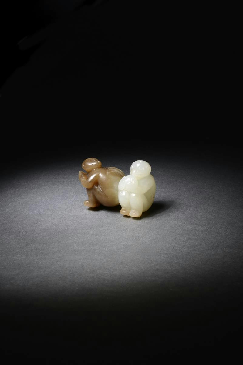A Chinese celadon jade carving of two monkeys 18th/19th century, one seated with its back to the other and holding a fruiting peach spray, the other holding a peach in its hands, the stone carved to highlight its russet-brown markings, 4.8cm.