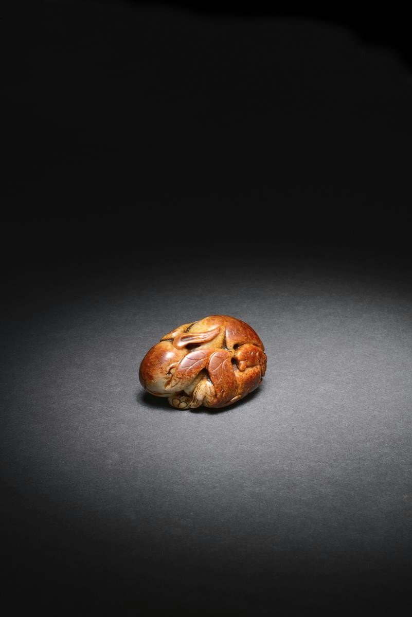 A Chinese pale celadon and russet jade carving of a rabbit Song dynasty or later, crouching with its ears flattened across its back, a baby rabbit to its side with a large leafy stem in its mouth, 4.1cm.