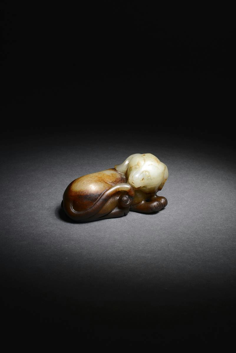 A Chinese celadon and brown jade carving of a hound probably late Ming dynasty, recumbent with its front paws outstretched, its head turned to reach for its curling tail, 6.5cm.