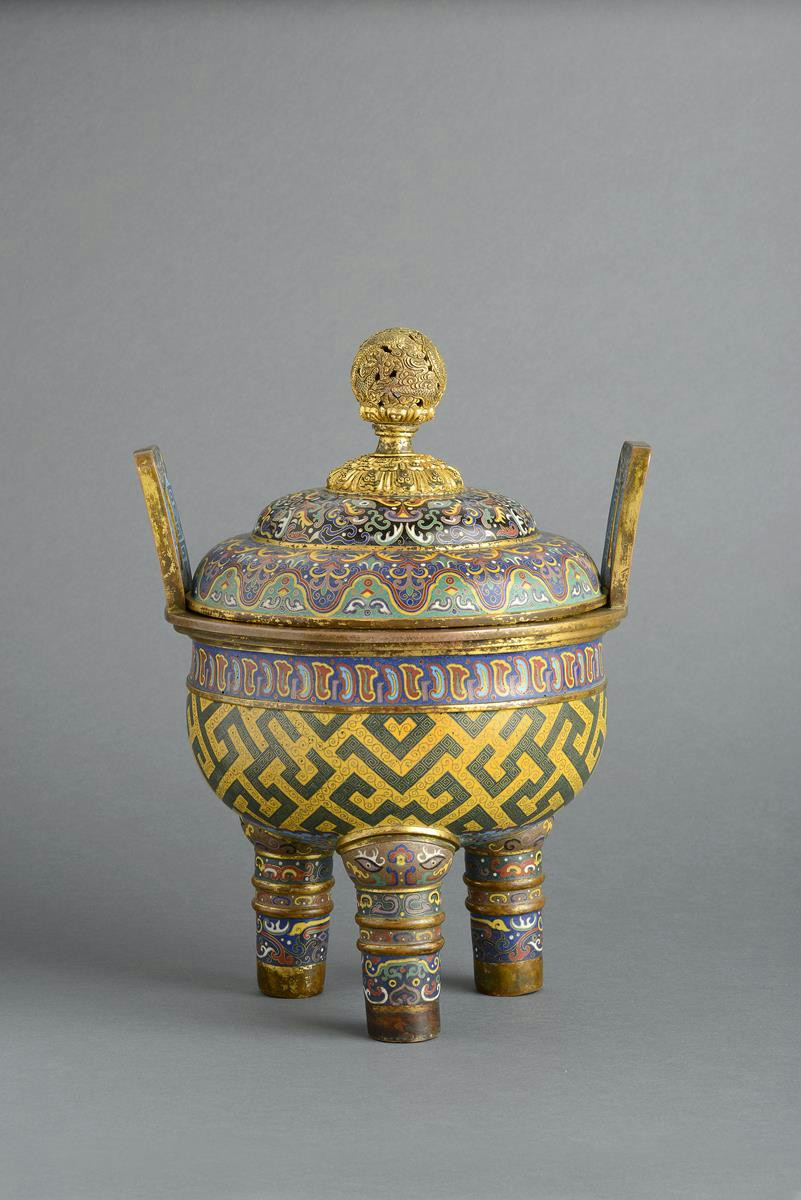 A large Chinese cloisonné tripod incense burner and cover four character Qianlong mark but probably late Qing, the ovoid body decorated with a wide band containing an irregular key fret design above a circular panel of continuous scrolling lotus and acanthus to the base, the three robust legs with bands containing stylized taotie masks and C-scrolls, the rectangular handles with further masks, the cover with continuous scrolling leaf and taotie designs and surmounted by an elaborate gilt metal reticulated finial depicting a five-clawed dragon amidst clouds, 38.7cm. (2)