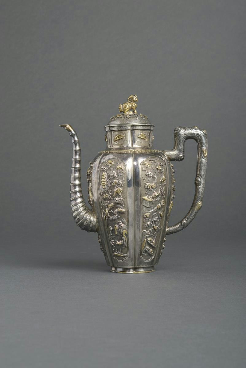 A rare Chinese parcel-gilt hexagonal-section silver teapot and cover Kangxi 1662-1722, the lobed body with six panels cast in relief depicting small figures, pagodas, flowers, trees and birds, the handle modelled as a gnarled branch, the spout as a tapering section of bamboo, the neck with Buddhist emblems above a band of gilt ruyi-heads, the cover surmounted by a gilt Buddhist lion dog, unmarked, 18cm. (2)