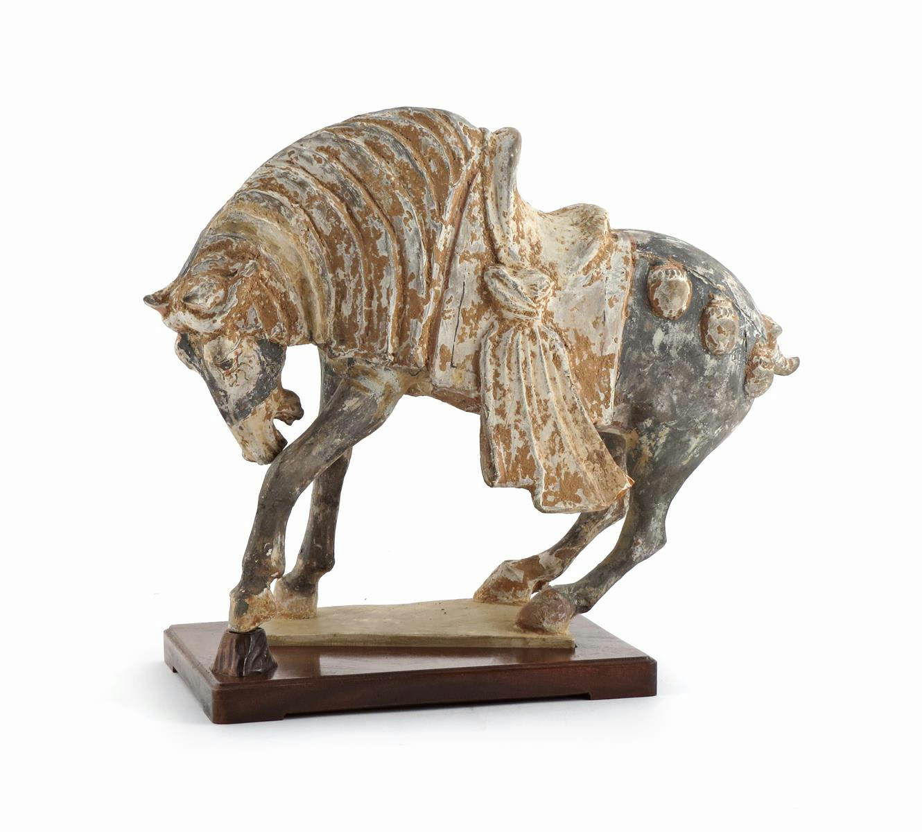 A Chinese pottery model of a horse Tang dynasty or later, theatrically modelled with its head lowered, pawing at the ground, mounted with a saddle, and with traces of cold painted pigments, a modern hardwood stand, 30cm. (2)