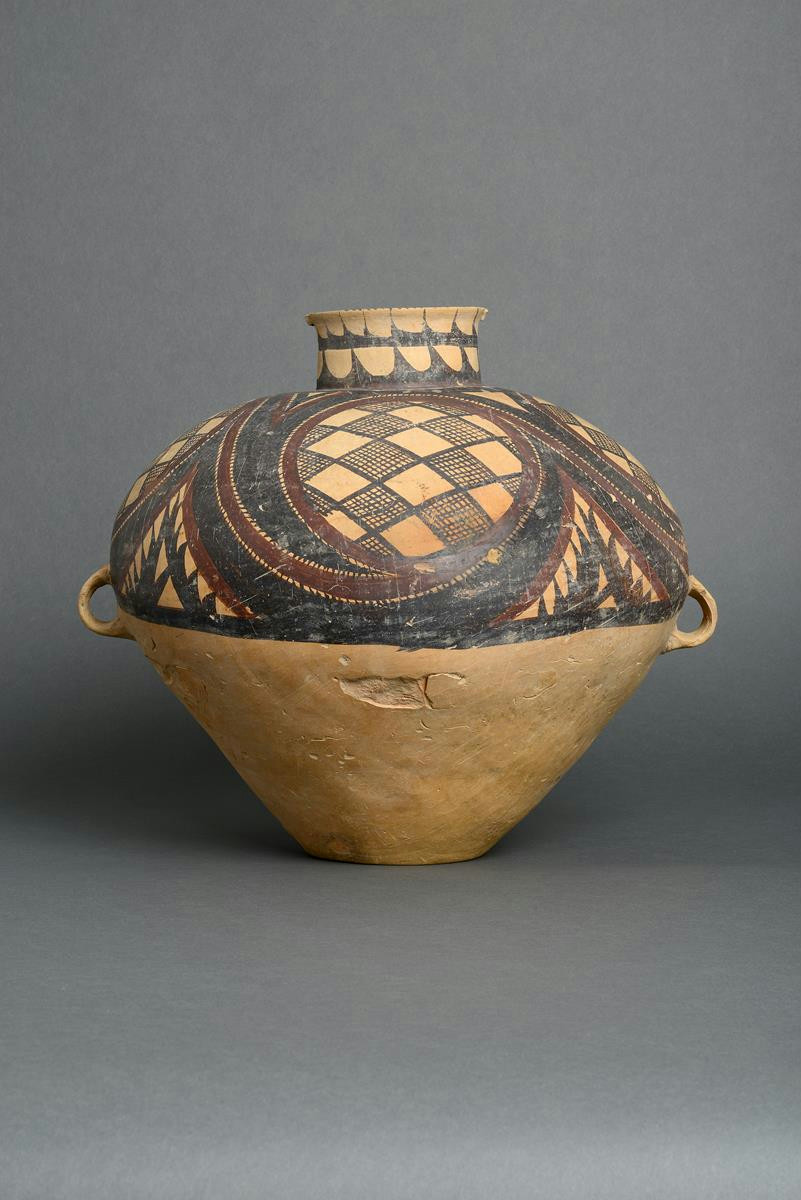A large Chinese Neolithic vase c.2000 BC, the ovoid body tapering to the footrim and with lug handles, painted in red and black pigments with spirals, the centre of each with a rhomboid checkered design and with triangular motifs beneath, the cylindrical neck with waves, 39cm.