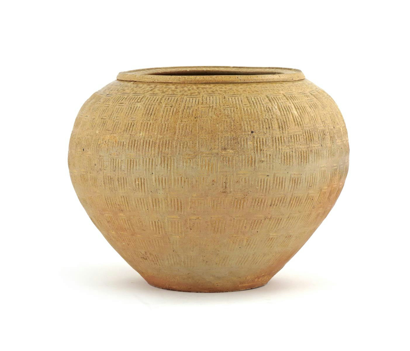 A large Chinese pottery ovoid vase Warring States period 475-221 BC, the rounded body with a flat moulded rim, the exterior decorated with a continuous spiral of geometric motifs rising from the base, decorated with a sandy-yellow glaze, 36cm dia.