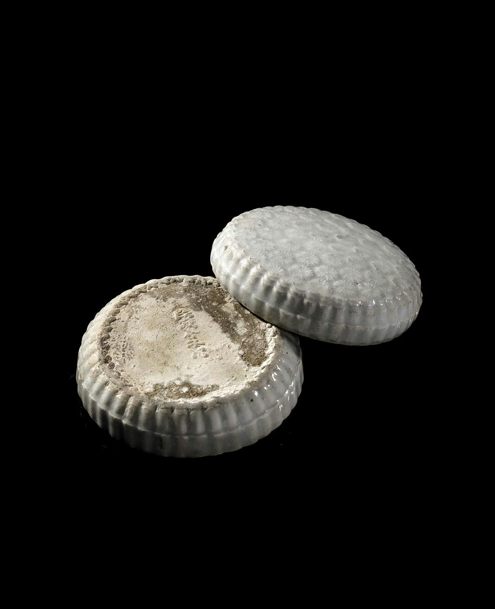 A rare Chinese qingbai cosmetics box and cover Song dynasty 960-1279 AD, moulded in relief with a regular florette design within gadrooned borders, the base with a five character mark moulded in relief which reads duan jia he zi ji (made by the Duan family in Jingdezhen at the Hu Tian kiln), 8.5cm. (2)
