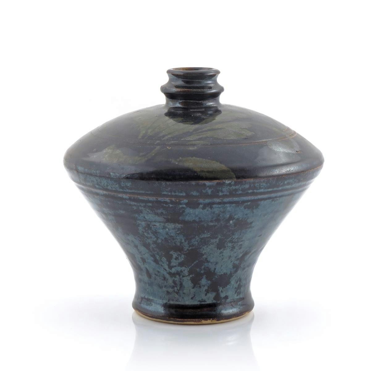A Chinese black glazed vase Jin dynasty 1115-1234 AD, the body widely flaring from the splayed foot, the domed shoulder incised with concentric bands, meeting a narrow knopped neck, decorated with an unctuous blue-black glaze, a freely drawn foliate design in ochre-yellow, 21.5cm high.